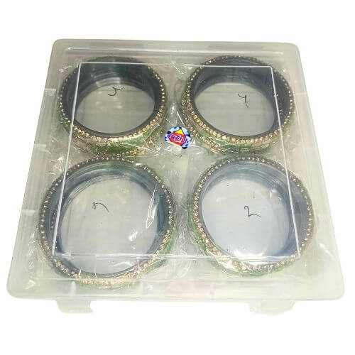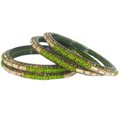 A striking trio of glass bangles adorned with shimmering golden accents and intricate detailing.