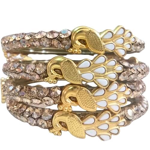 Set against a subtly sparkling base, the peacock elements add movement and charm, giving the bangles a distinctive, story-driven appeal.